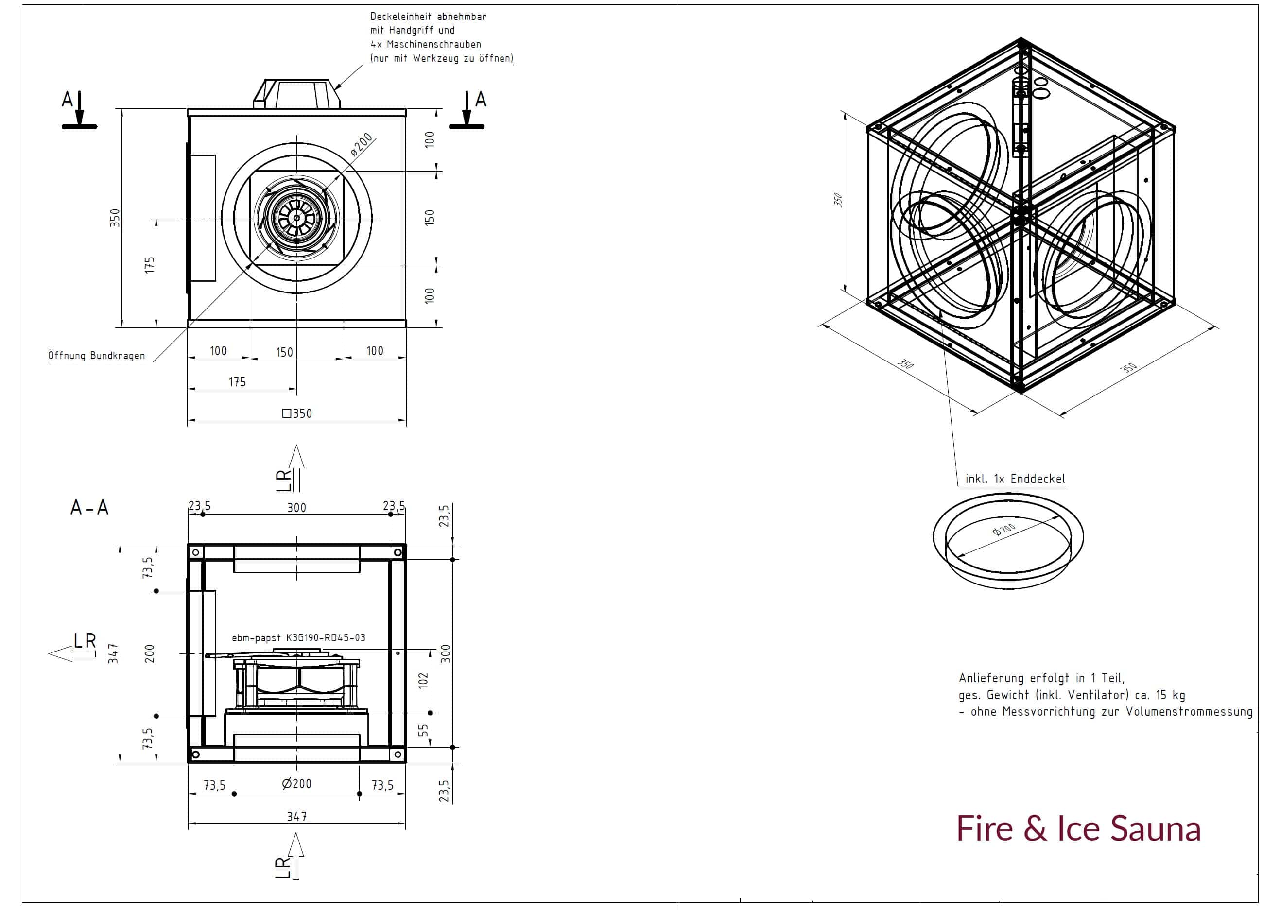 Die Ventilatoren werden in schall- und wärmegedämmten Boxen aus 1mm starkem, verzinktem Stahlblech integriert. Die Ventilatoren sind so in die Boxen eingebaut, dass der Luftstrom je nach Bedarf axial oder um 90° geführt werden kann. Dabei wird die nicht benutzte Luftzuführung mit einer Klappe fest verschlossen. Die Boxen können nicht geöffnet werden. Der Wirkungsgrad des kommutierten Motors beträgt nicht weniger als 75%, und ist in schwingungsfreier Ausführung.