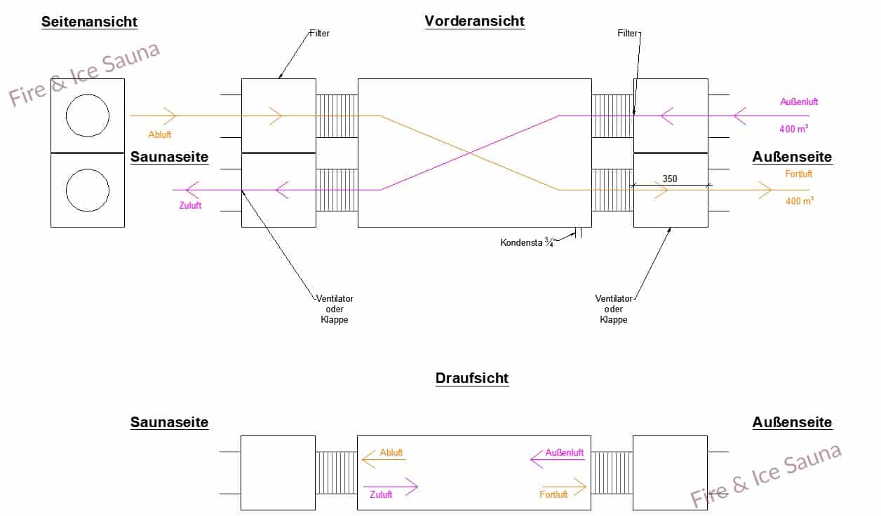 Die angesaugte Außenluft wird durch einen Filter in den Wärmetauscher gesogen, dort von der ebenfalls gefilterten Abluft vorgeheizt und durch den Ventilator in die Sauna geführt. Gegenläufig wird die Fortluft durch den Grobfilter der Klasse G3 (auf Wunsch auch Filterklasse F7 o. F9) in den Ventilator gesaugt und von dort aus durch den Gegenstromplattenwärmeübertrager umweltfreundlich nach außen geblasen. Das entstehende Kondensat wird an der niedrigsten stelle der Fortluftseite des Wärmetauschers abgefangen und in einen Syfon abgeleitet.